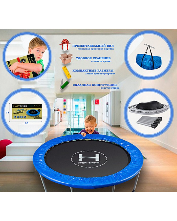 Мини-батут Hasttings 36 предназначен для использования в любых помещениях и на улице. Его легко сложить, а небольшой вес и размер в собранном виде позволяет транспортировать батут в автомобиле любого размера. Прыжки на батуте – отличный способ развлечь детей и потренировать их чувство равновесия.