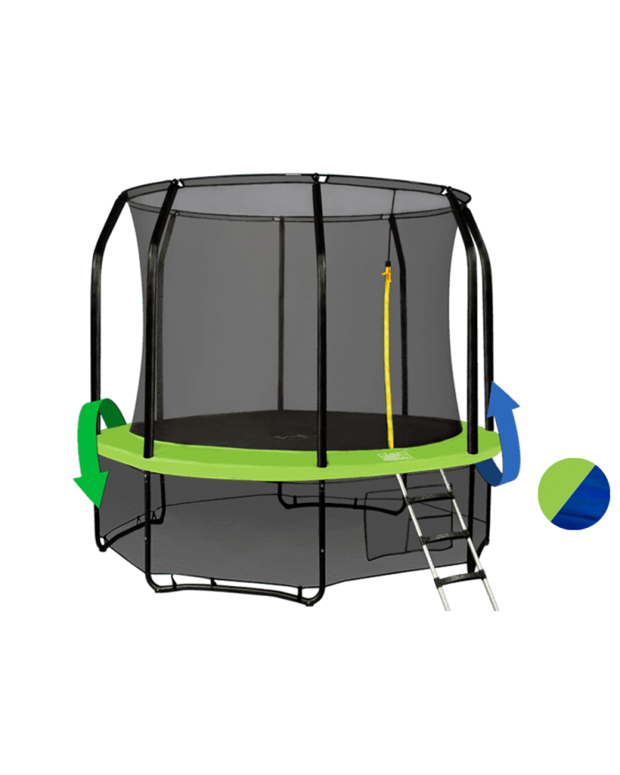 Опция DOUBLE — это возможность использовать две стороны мата! Решаете Вы! Просто переверните мат и Ваш батут сегодня может быть синим, а завтра зеленым. Кроме того, мы добавили слой черного покрытия для рамы батута, на контрасте такое решение придает новинке стильность и общий красивый вид. Помимо двойной оцинковки рамы, черное порошковое окрашивание стало заключительным, третьим, штрихом в безупречной защите от ржавчины.