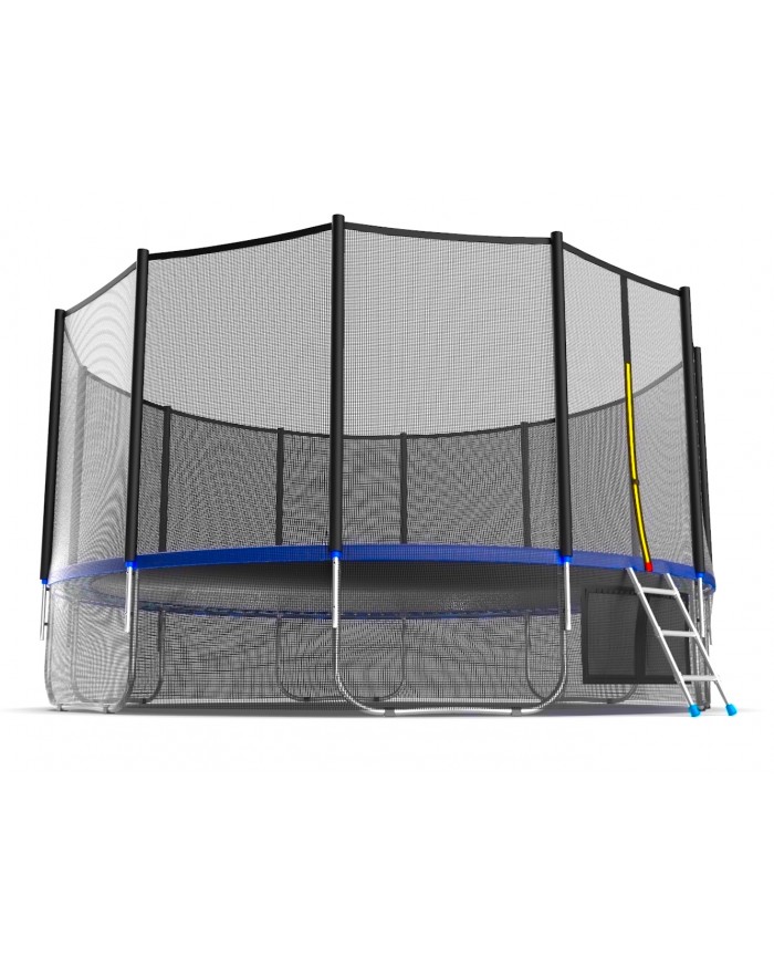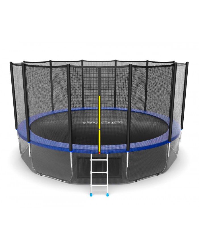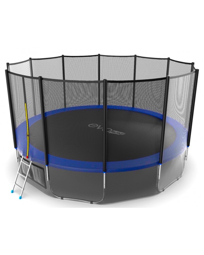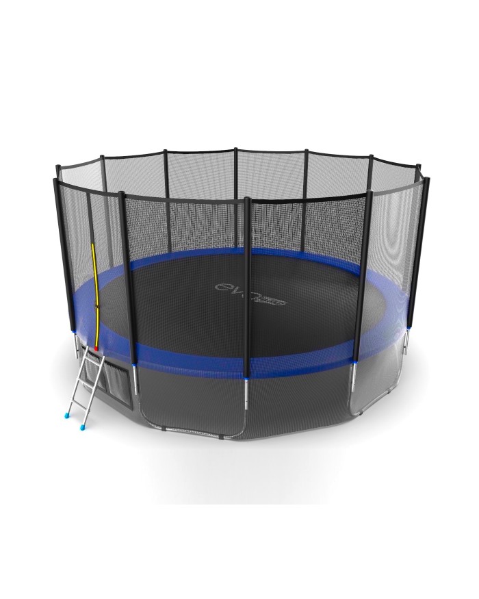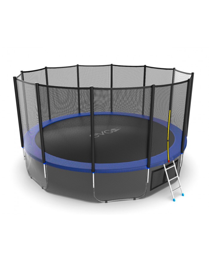 - Комплектация Evo Jump External 16ft, помимо самого батута, включает металлическую лестницу, облегчающую попадание внутрь тренажера, а также верхнюю защитную сетку, предотвращающую падение наружу.
