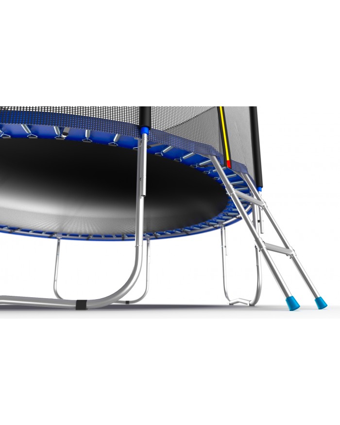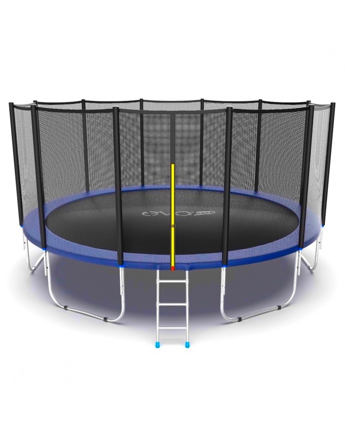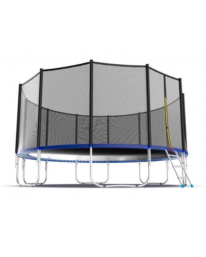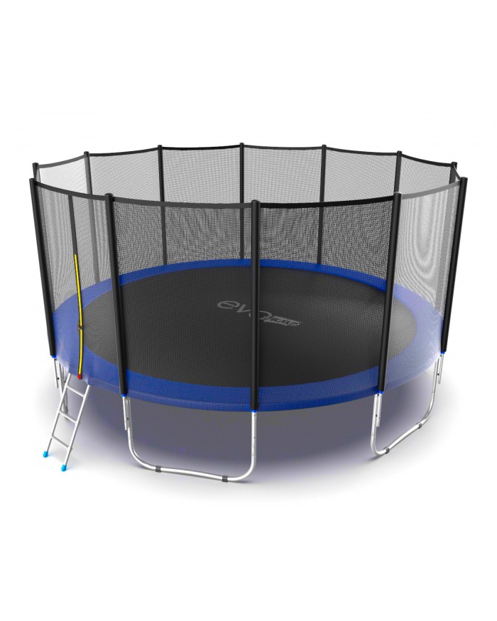 - Комплектация Evo Jump External 16ft, помимо самого батута, включает металлическую лестницу, облегчающую попадание внутрь тренажера, а также верхнюю защитную сетку, предотвращающую падение наружу.