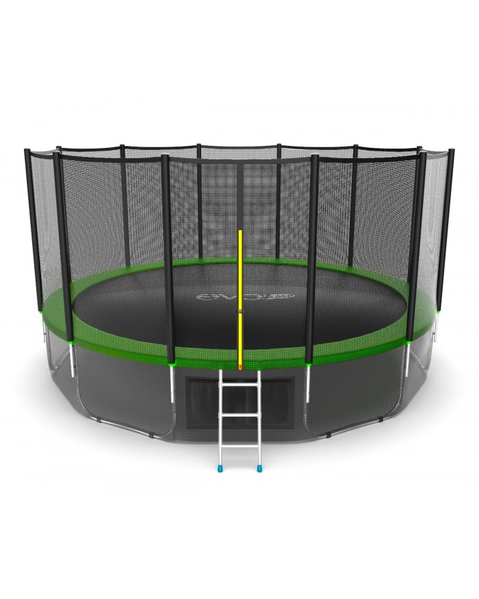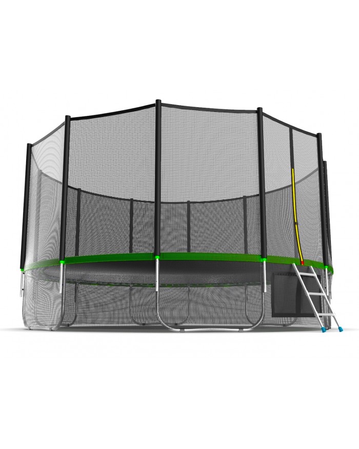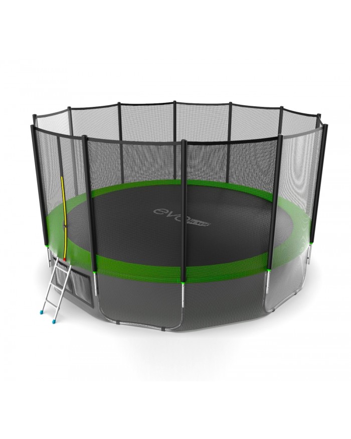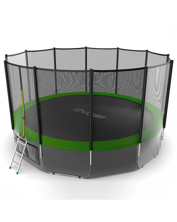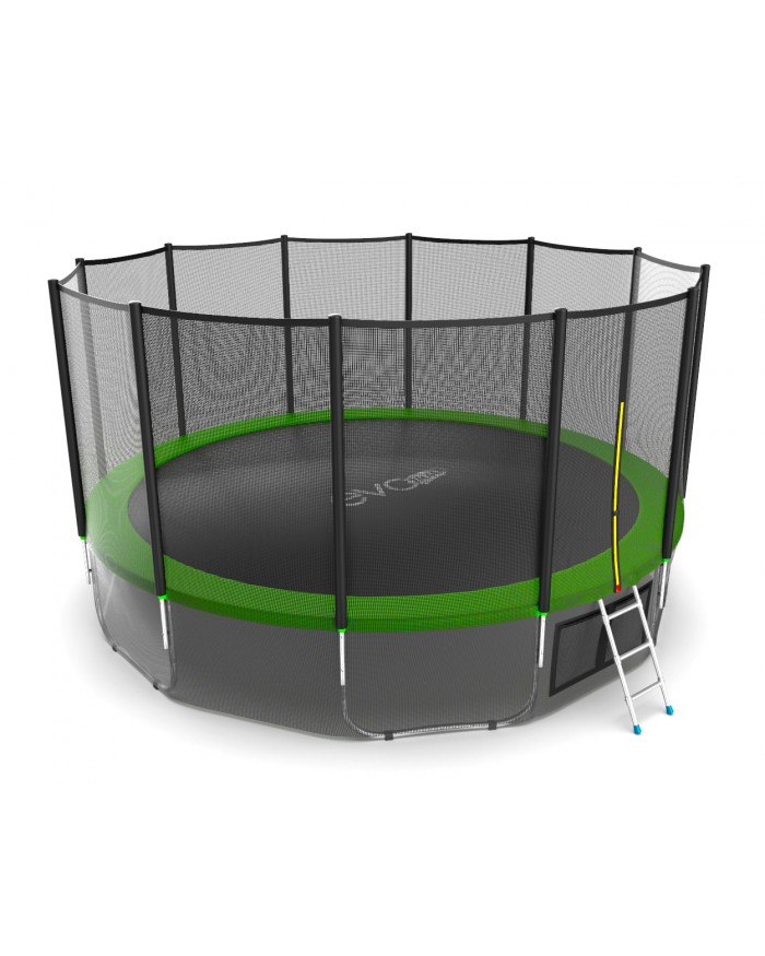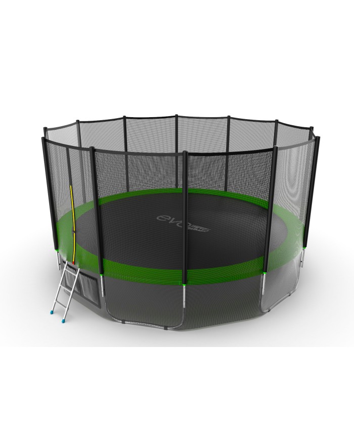 - Комплектация Evo Jump External 16ft, помимо самого батута, включает металлическую лестницу, облегчающую попадание внутрь тренажера, а также верхнюю защитную сетку, предотвращающую падение наружу.