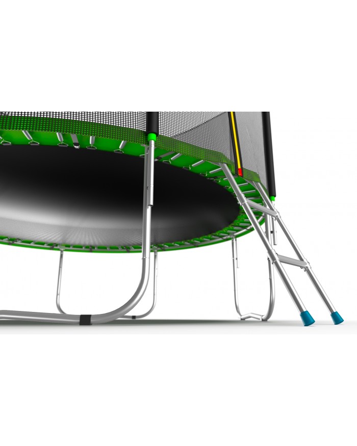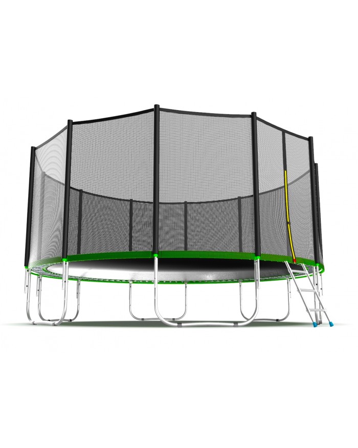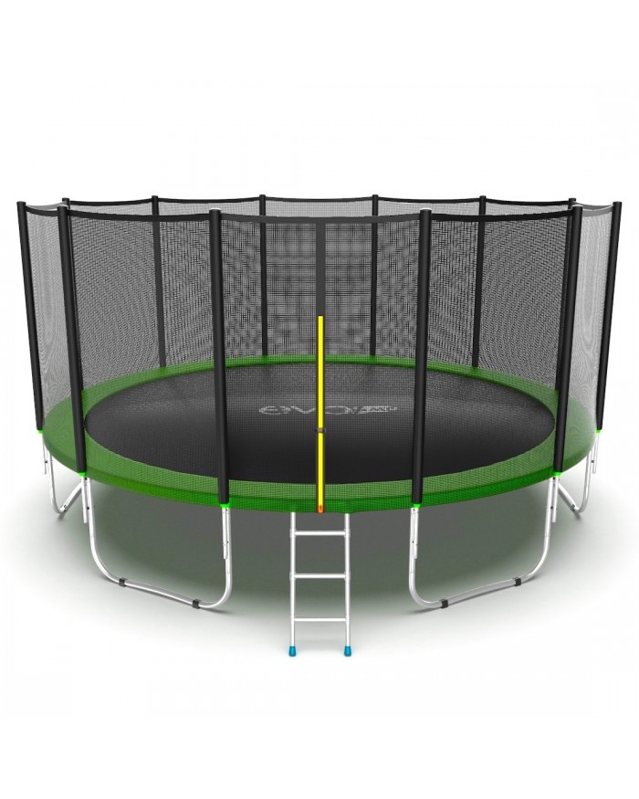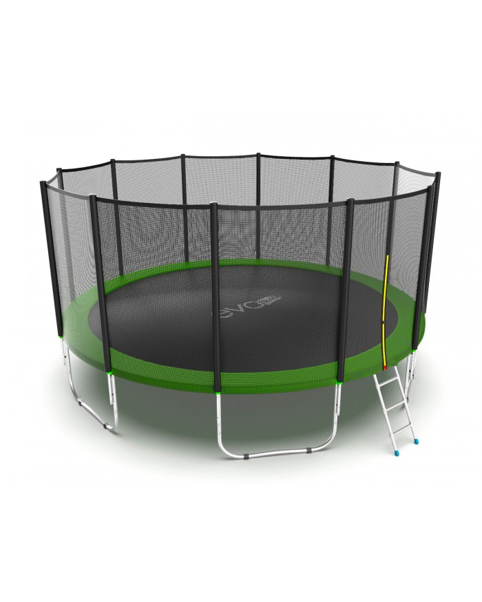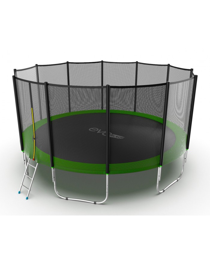 - Комплектация Evo Jump External 16ft, помимо самого батута, включает металлическую лестницу, облегчающую попадание внутрь тренажера, а также верхнюю защитную сетку, предотвращающую падение наружу.