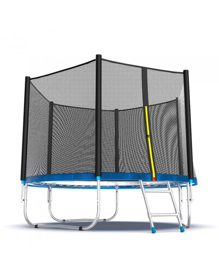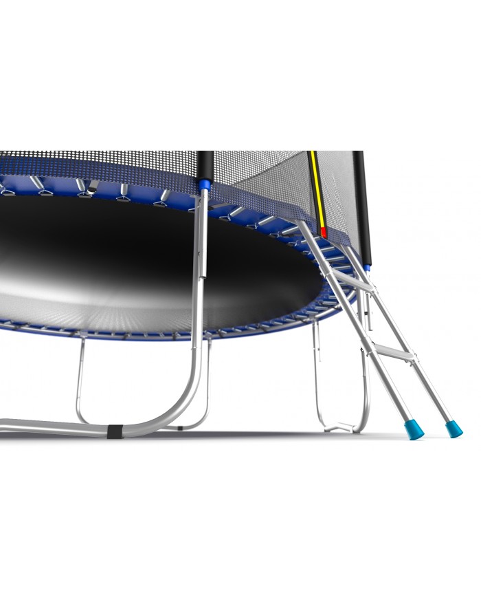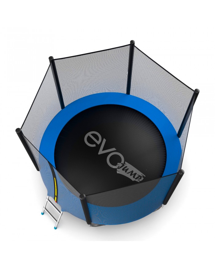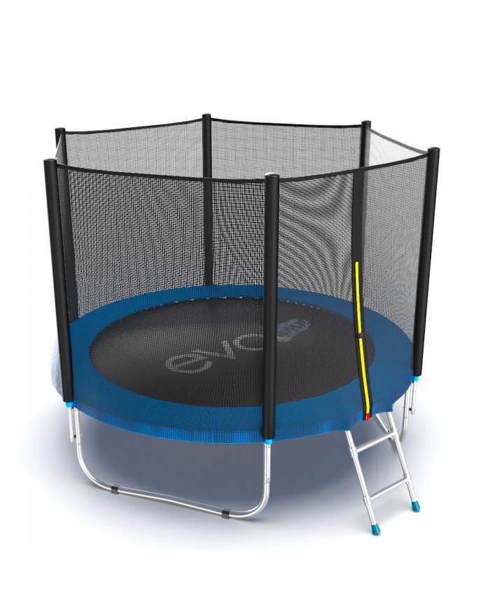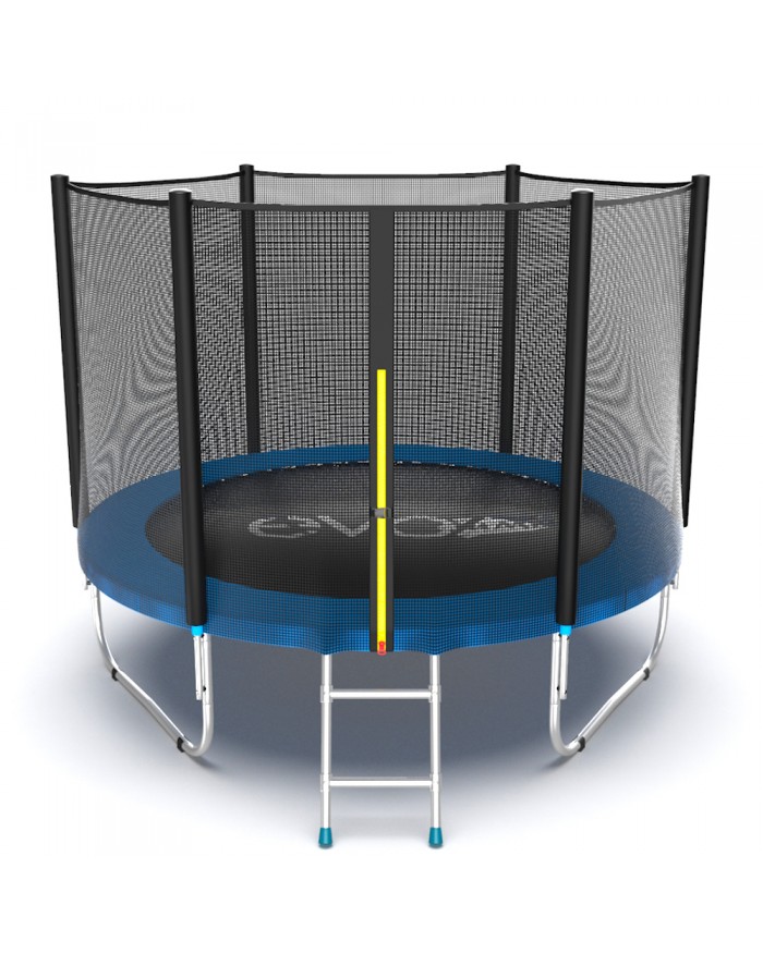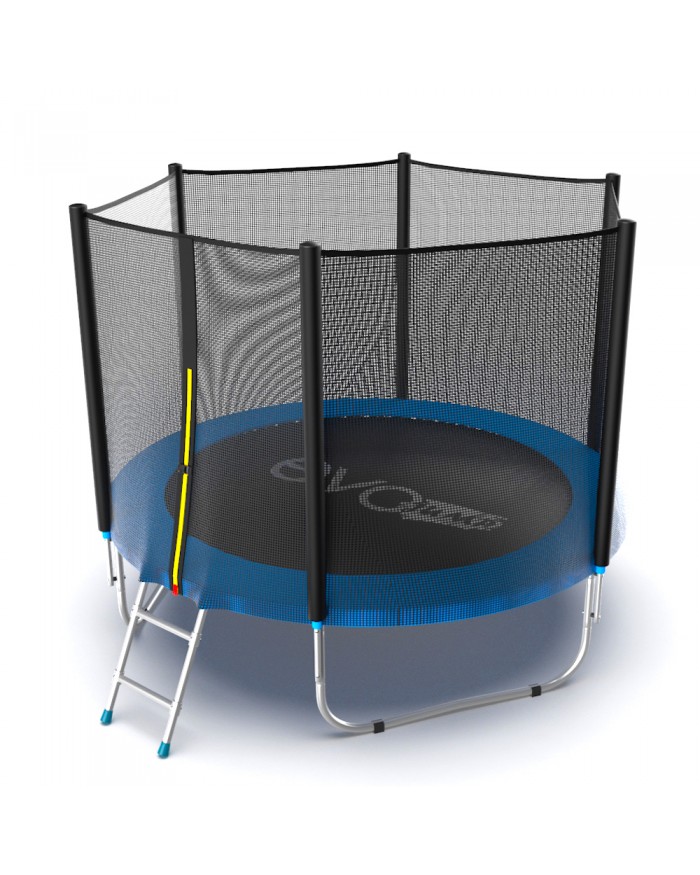 - В комплектацию поставки Evo Jump External 8ft, помимо батута, входят металлическая лестница и высокая верхняя сетка, исключающая выпадение наружу.