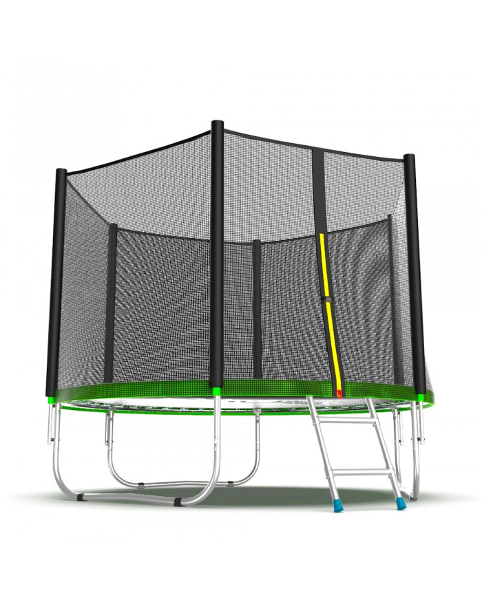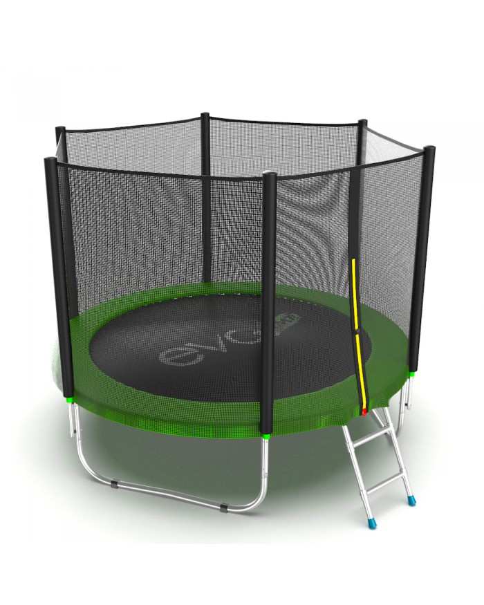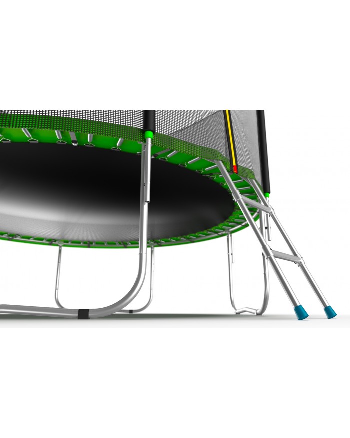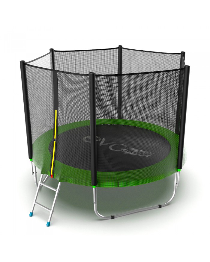 - В комплектацию поставки Evo Jump External 8ft, помимо батута, входят металлическая лестница и высокая верхняя сетка, исключающая выпадение наружу.