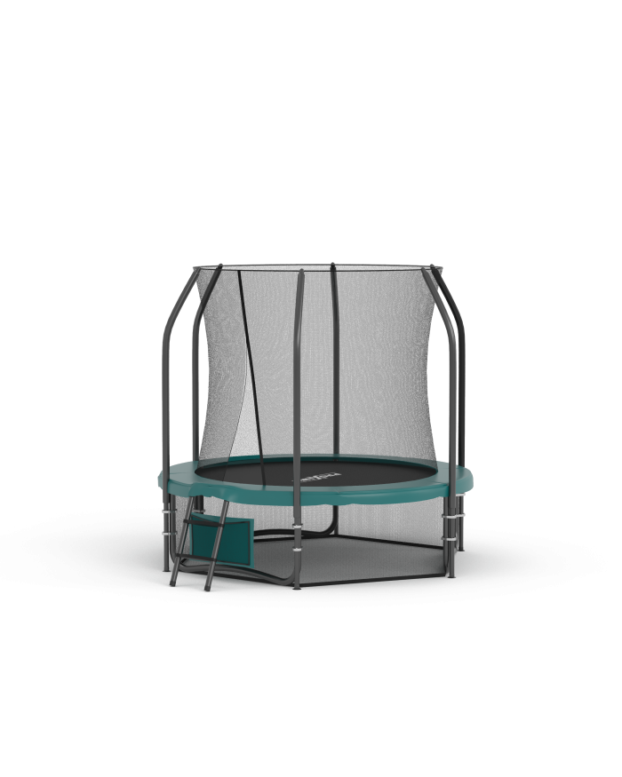 - Комплектация тренажера: сам батут с защитной сеткой, удобная лестница, нижний защитный барьер, удобный мешок для обуви.