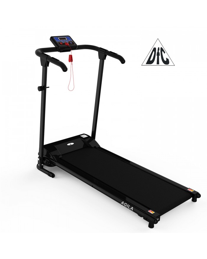 - Стильный черный дизайн — первое, чем привлечет покупателей беговая дорожка DFC AGILA T99. По мнению специалистов Stemsport, это отличный тренажер для домашнего семейного использования.