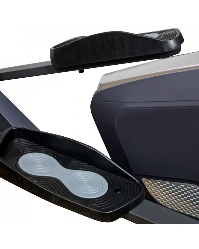 Мощная рама тренажера, усиленная конструкция из стального профиля, позволит заниматься пользователю весом до 120 кг. Широкие педали с нескользящей вставкой. Транспортировочные колеса в передней части обеспечивают свободное перемещение тренажера по комнате. Задний стабилизатор с регулировкой положения на неровной поверхности.