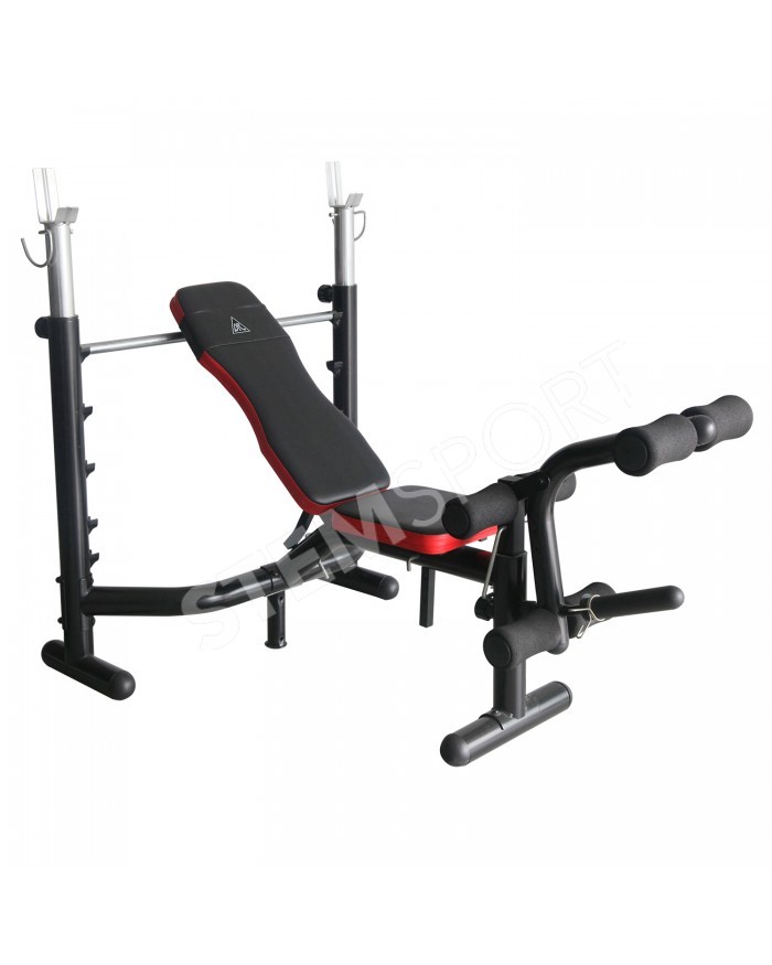 Силовая скамья со стойками под штангу. Дополнительно установлена опция жим ногами.