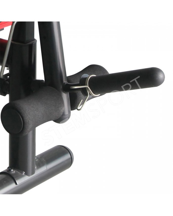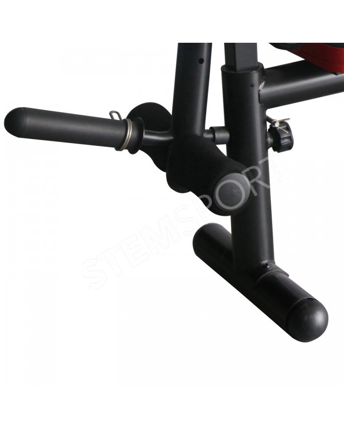 Рычаги блока для ног снабжены мягкими валиками. Стойки тренажера регулируются по высоте.