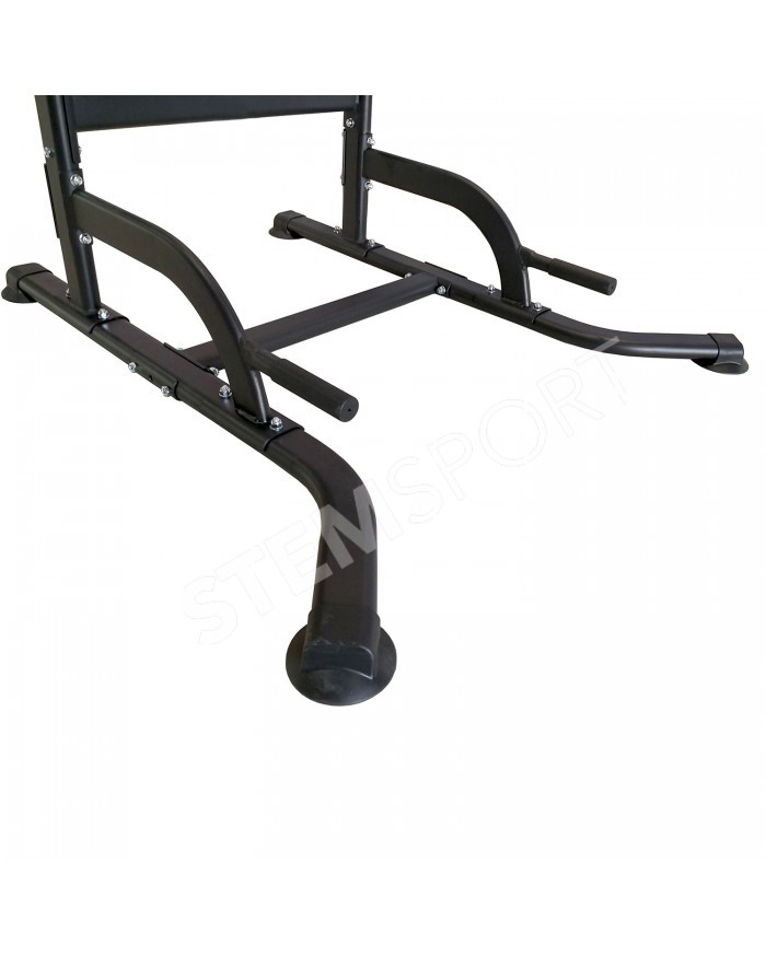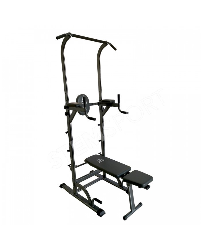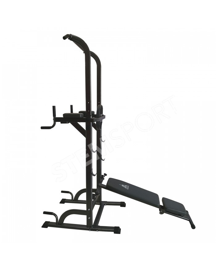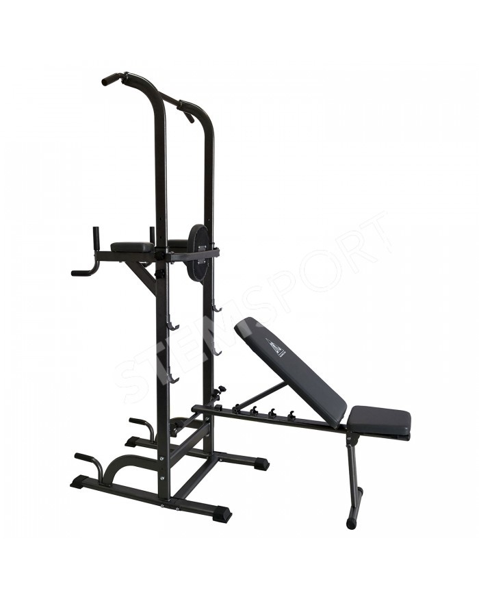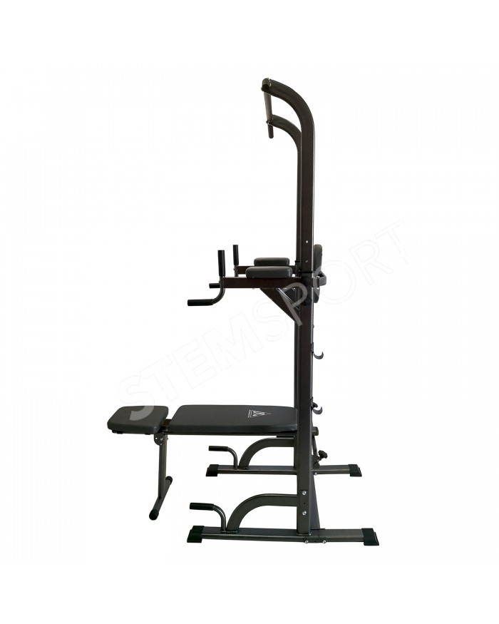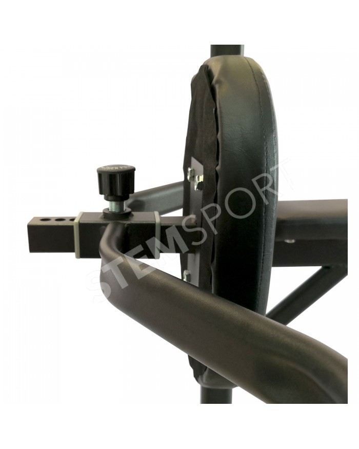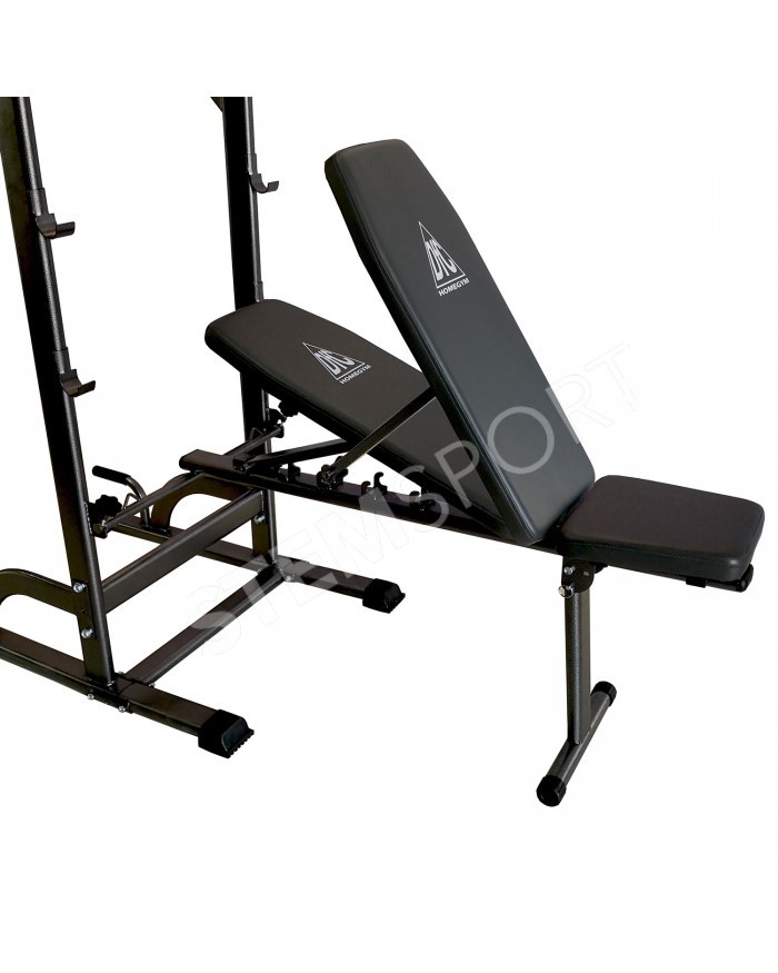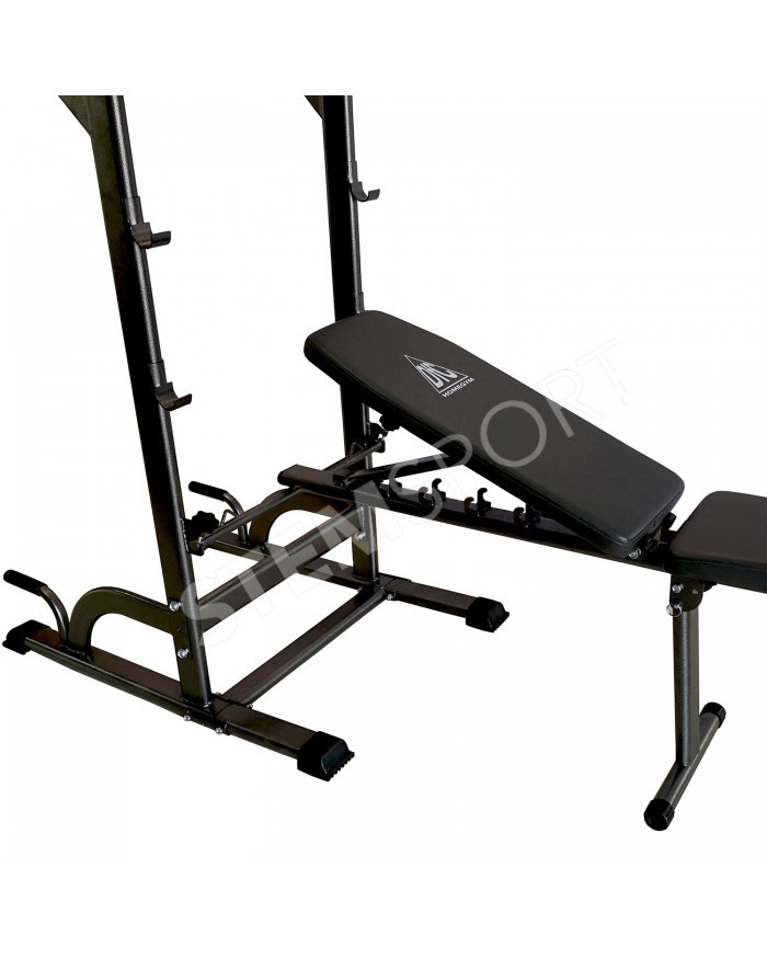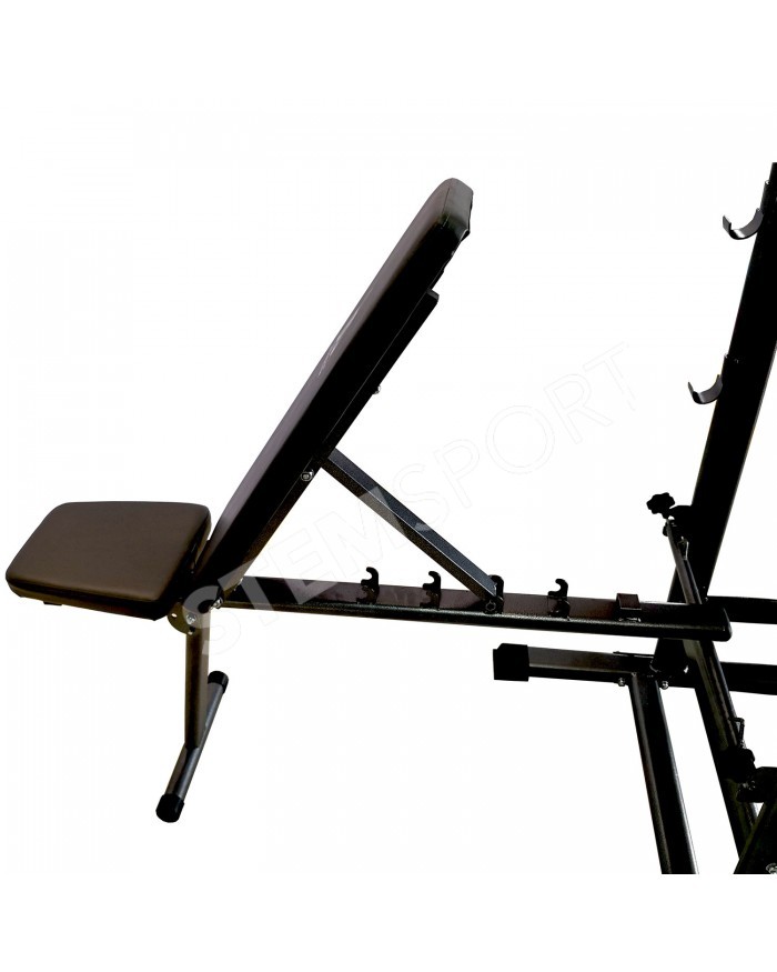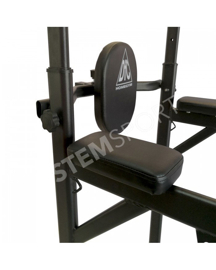 В комплекте идет универсальная скамья с регулировкой угла наклона спинки. С помощью парных крючков на раме турника возможно установить скамью под разным углом для выполнения различных упражнений.