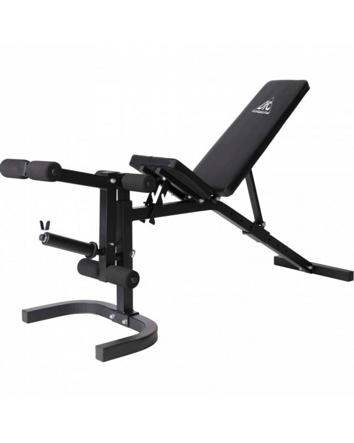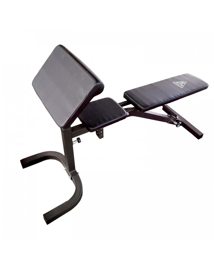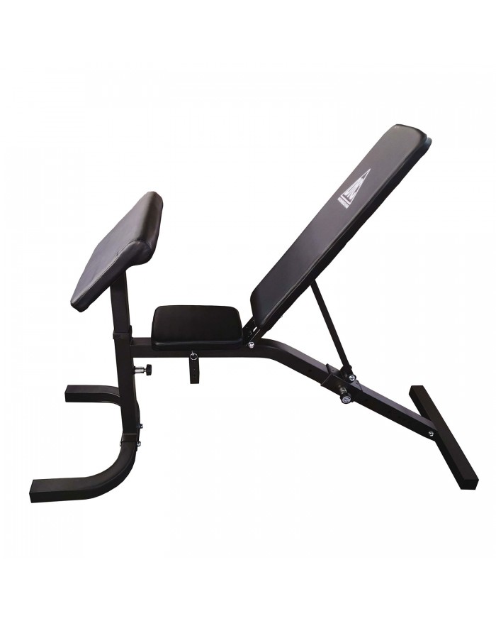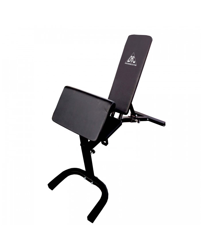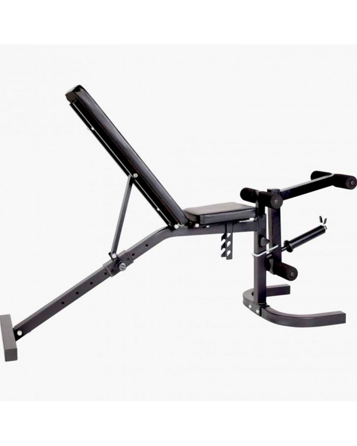 В комплекте идет универсальная силовая скамья с дополнительными опциями: партой для бицепса и жим ногами. Сиденье и спинка скамьи регулируются по углу наклона. Сиденье 3 положения, спинка 7. Скамья, валики для ног и парта имеют износостойкую обивку из кожзама. В качестве нагрузки на жим ногами используются диски с посадочным Ø31 и Ø51 мм (переходник в комплекте). Нагрузка на скамью до 400 кг.