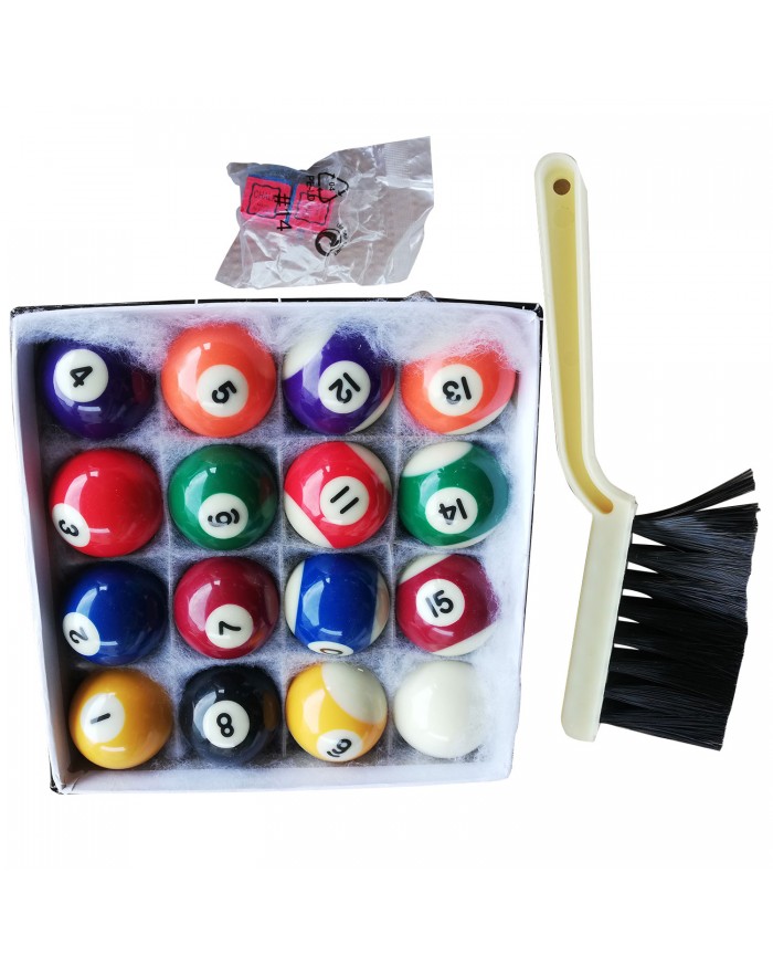 В комплекте все необходимые акссесуары: 2 кия, набор шаров для пула, треугольник, щетка, 2 мела.