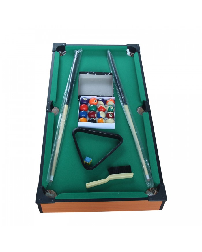 Домашний мини-бильярдный стол для игры в пул. Корпус выполнен из специально обработанного МДФ, сверху покрытого ПВХ-пленкой. В комплекте все необходимые акссесуары: 2 кия, набор шаров, треугольник, щетка, мел. Настольные игры являются отличным развлечением дома или на даче. Игровой стол будет не только отличной покупкой для себя, но и прекрасным подарком.