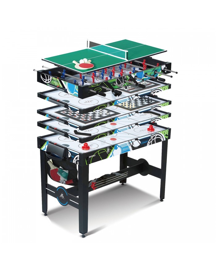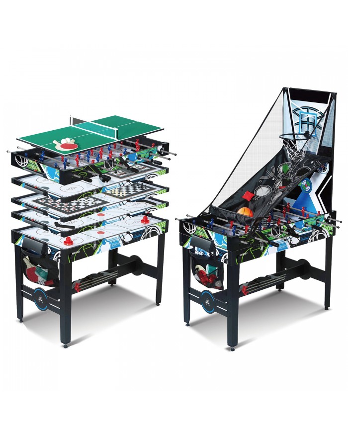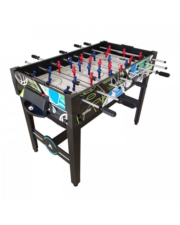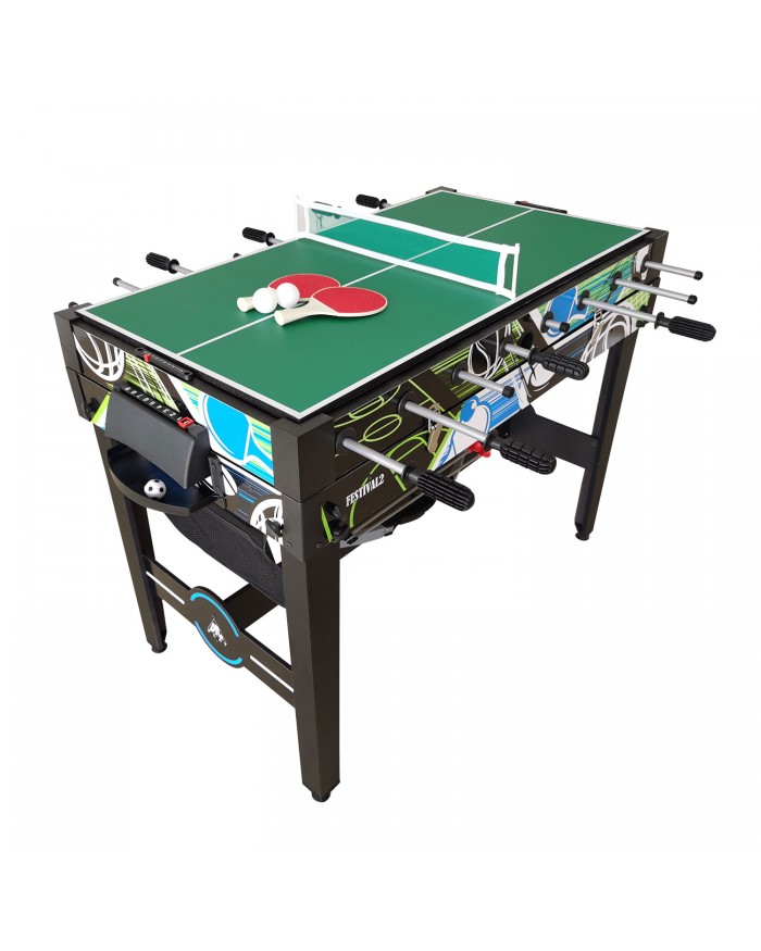 Многофункциональная модель стола-трансформера 12 в 1 FESTIVAL2 включает в себя игры в футбол (соккер), аэрохоккей, настольный теннис, баскетбол, стрельба из лука, шашки, шахматы, нарды, кости, бросок мешка, аэрофутбол, настольный хоккей.