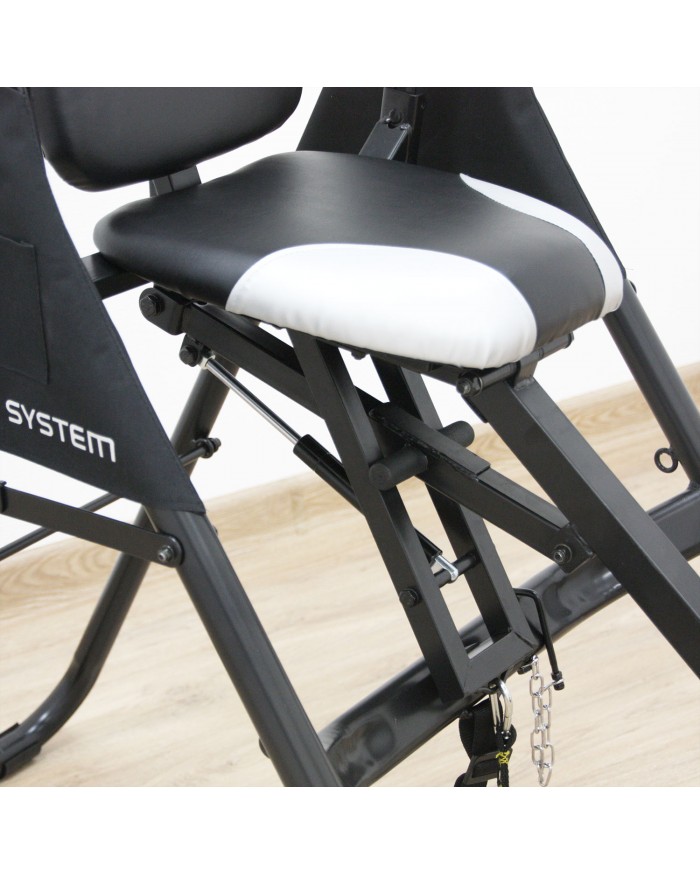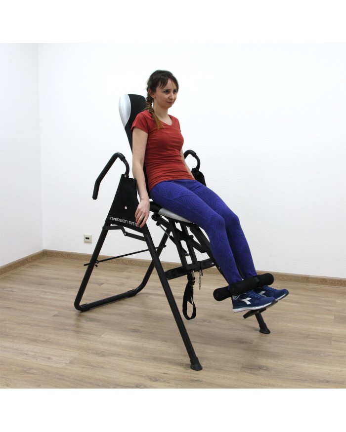 Отдельно остановимся на конфигурации самого стола. В начальном положении он имеет форму стула, что очень удобно. Вы просто садитесь на него и из этого положения фиксируете ноги с помощью подпружиненных валиков. Далее вам необходимо немного отклонится назад, чтобы стул распрямился с помощью встроенного амортизатора и принял форму стола. Стол фиксируется в таком положении. И дальше вы начинаете переворот головой вниз.