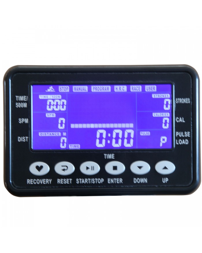 - На экране отображается: время тренировки, количество гребков в минуту и общее, пройденное расстояние, состояние пульса, калории, мощность.
