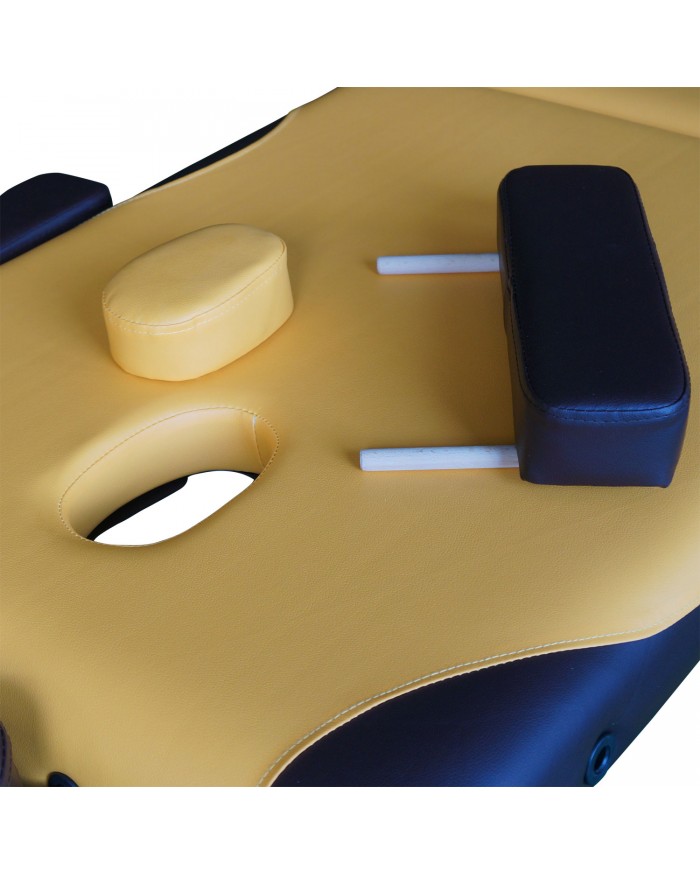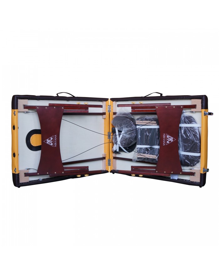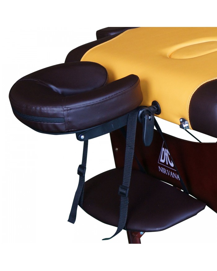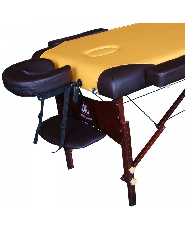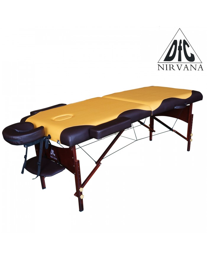- DFC Nirvana Relax «горчичный с коричневым» — двухсекционный массажный стол, созданный для эксплуатации в домашних условиях.