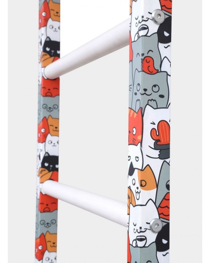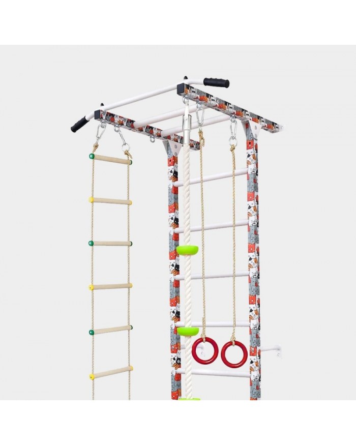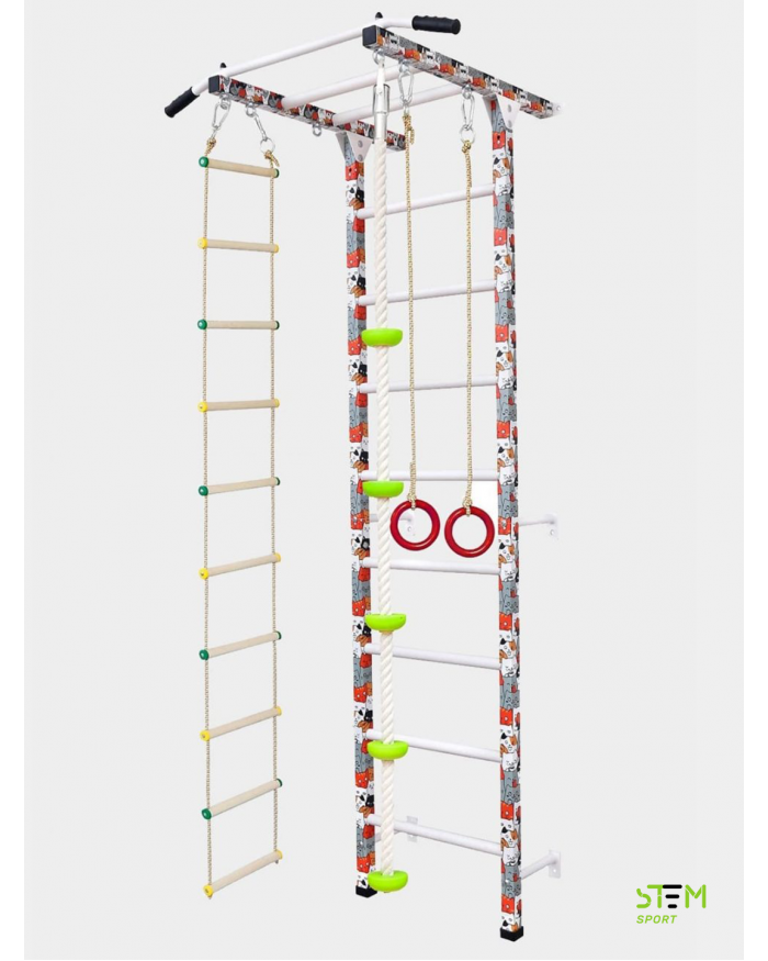 Стальной профиль выдерживает нагрузку до 120 кг. Ступени с покрытием ПВХ приятны на ощупь и не скользят. Всё навесное оборудование можно снимать и менять местами, дополнять новыми вариантами и удобно хранить в сложенном виде. Дизайн нарисован на самой шведской стенке, а значит не отклеется во время использования и не боятся воды.