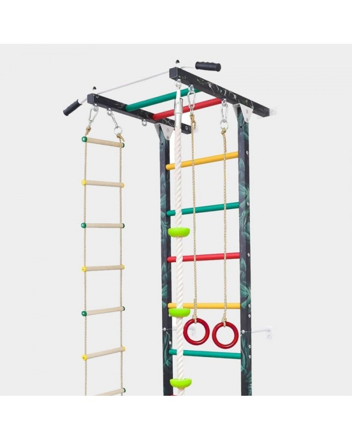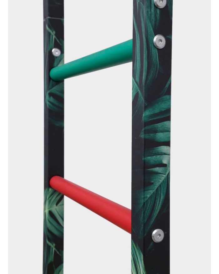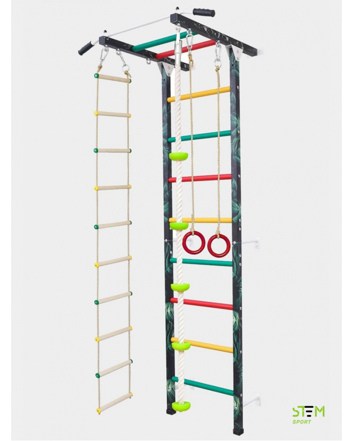 Стальной профиль выдерживает нагрузку до 120 кг. Ступени с покрытием ПВХ приятны на ощупь и не скользят. Всё навесное оборудование можно снимать и менять местами, дополнять новыми вариантами и удобно хранить в сложенном виде. Дизайн нарисован на самой шведской стенке, а значит не отклеется во время использования и не боятся воды.