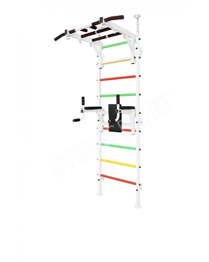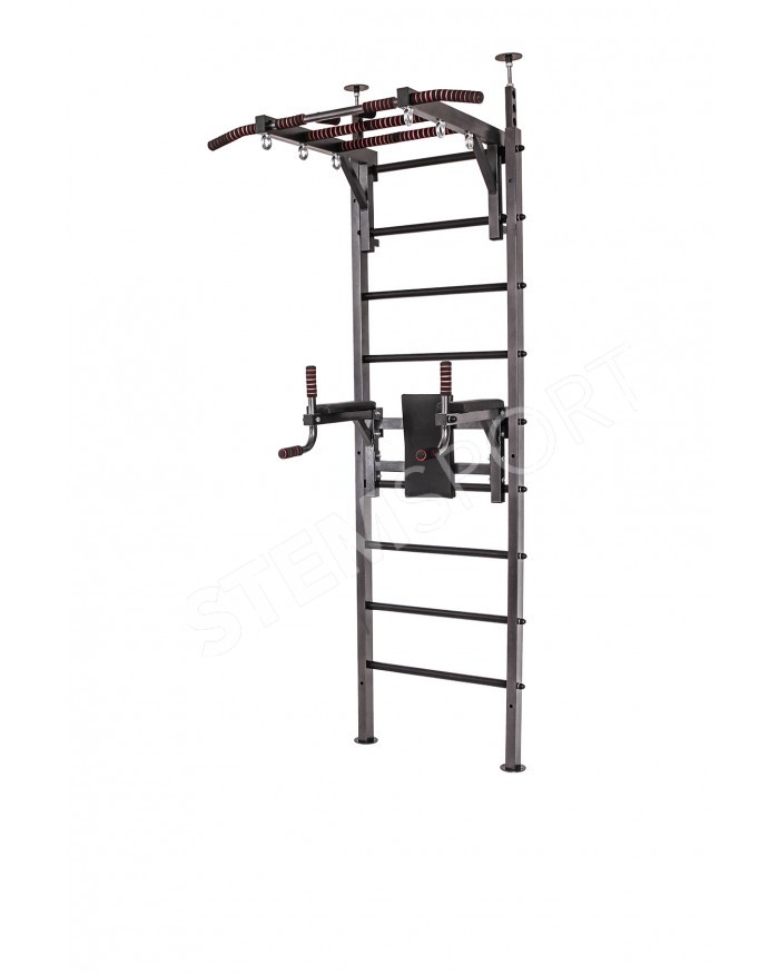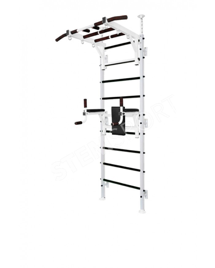 1) Шведская стенка "В распор" изготовлена из профиля 60*40 мм. Подойдет для не очень прочных стен в частных коттеджах, а также многоквартирных домах со стенами из гипсокартона. Стенка крепится в распор между потолком и полом. Так-же дополнительно, для большей надежности, ее можно закрепить и к стене. Благодаря этому, конструкция выдерживает нагрузки до 250 кг!