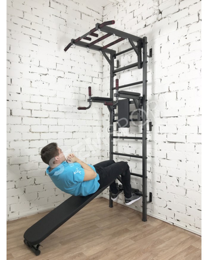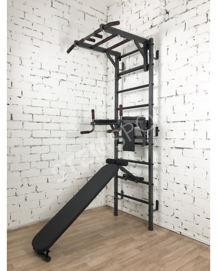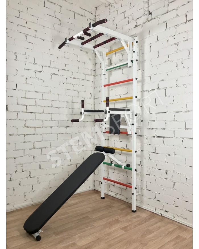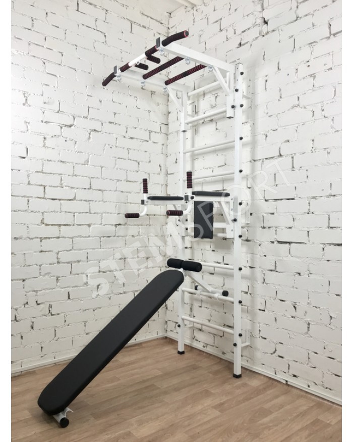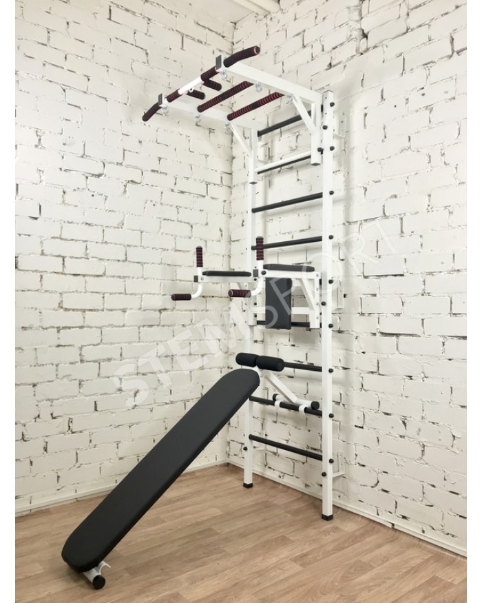 Это по сути спортивный конструктор, из которого Вы можете собрать спортзал своей мечты. Представляет собой она гимнастическую лестницу, турник 3 хвата, брусья-пресс-упоры под штангу и скамья для пресса/жима