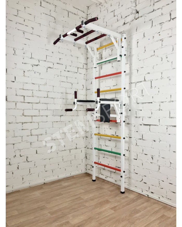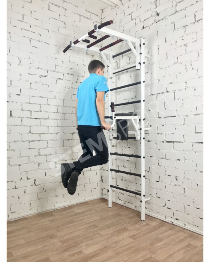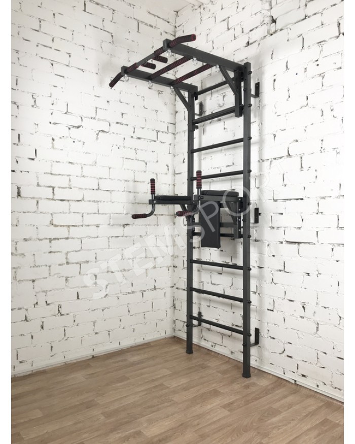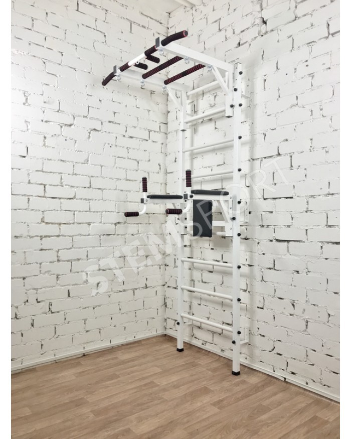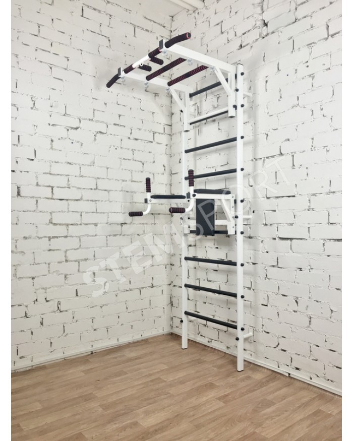 Это по сути спортивный конструктор, из которого Вы можете собрать спортзал своей мечты. Представляет собой она гимнастическую лестницу, турник 3 хвата и брусья-пресс-упоры под штангу