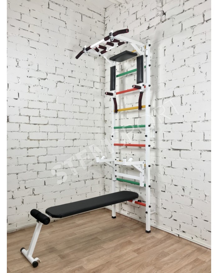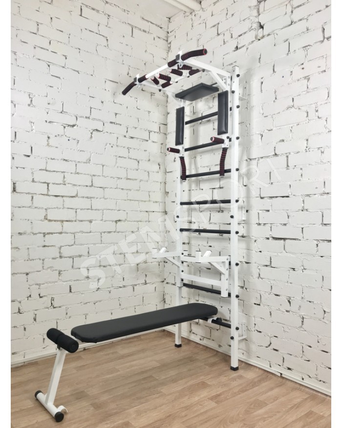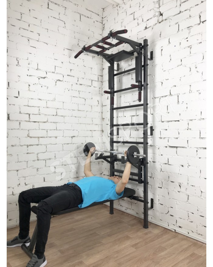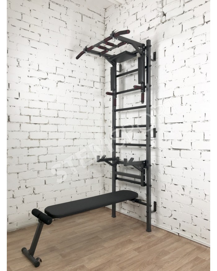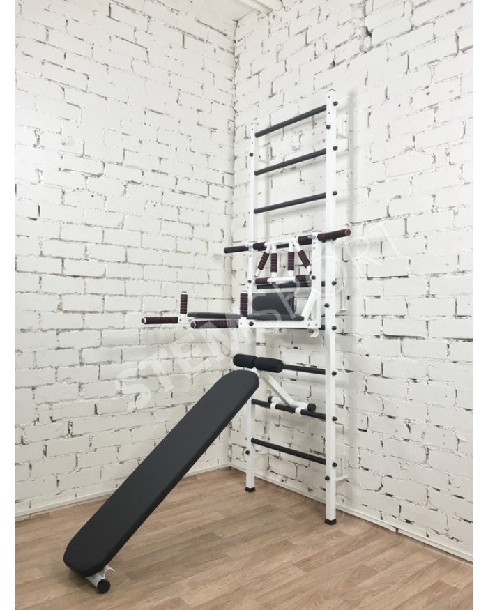 Это по сути спортивный конструктор, из которого Вы можете собрать спортзал своей мечты. Представляет собой она гимнастическую лестницу, турник 3 в 1, упоры для штанги и скамью для жим/пресса и.
