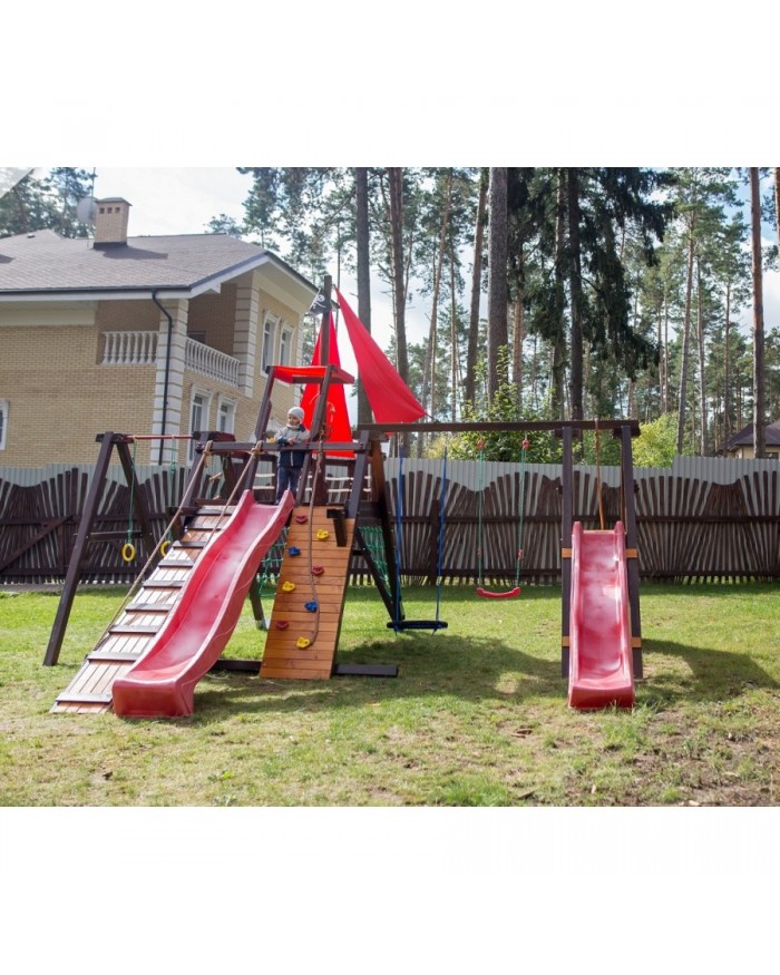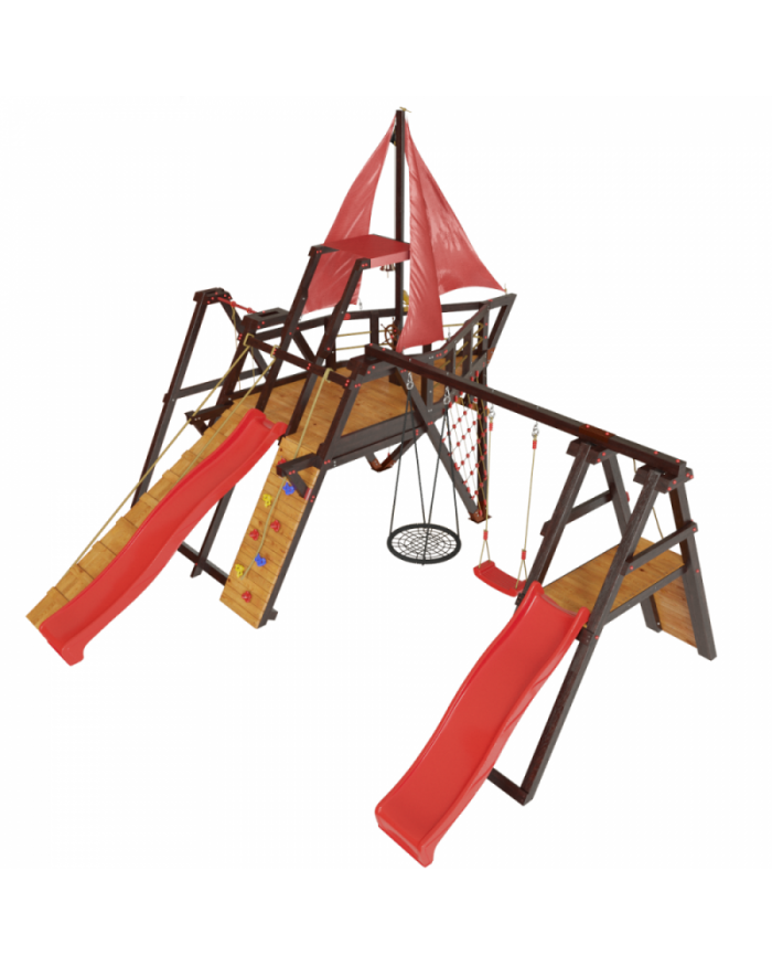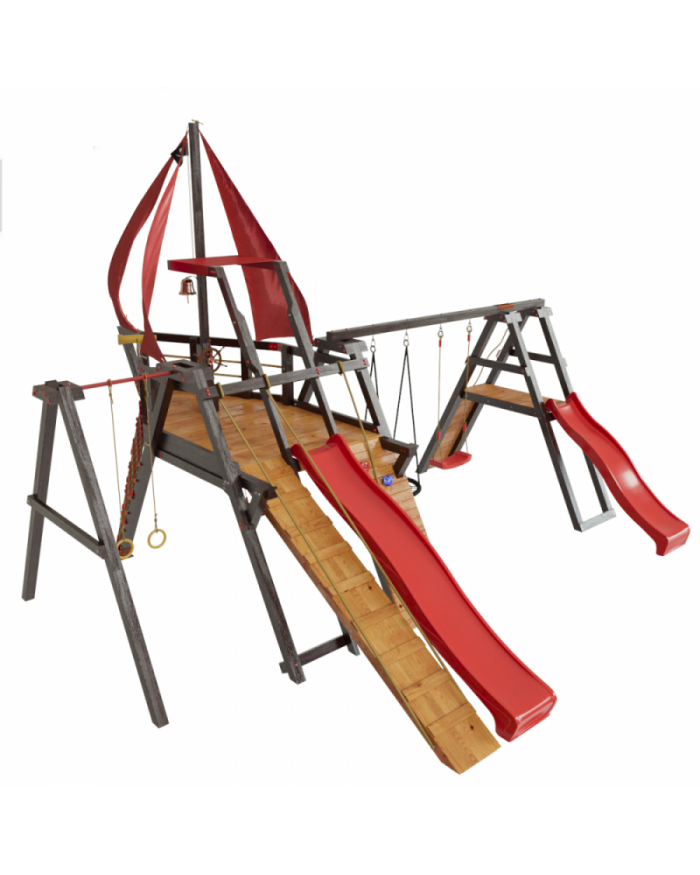 Товар поставляется в разобранном виде. В комплект для самостоятельной сборки входит подробная инструкция по сборке товара. Товар упакован в гофрокартонные короба в количестве: 19 мест + горка. Установка детской игровой площадки проводится на ровной поверхности, свободной от насаждений. Размер площадки не менее 8м х 9м. Рекомендуем зафиксировать конструкцию используя анкера любой формы.