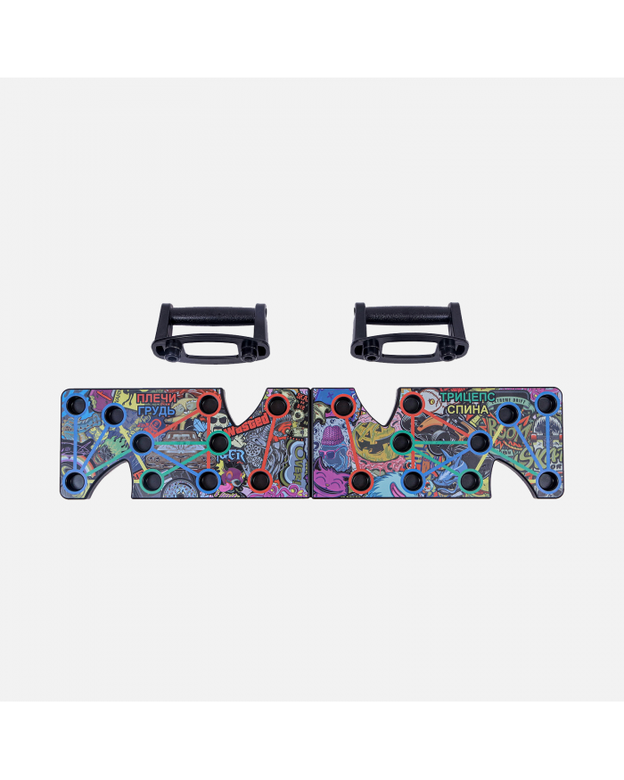 Спортивная доска с упорами для отжиманий, размеченная по специальной системе упражнений на различные группы мышц и зон торса - плечи, спину, руки, грудь. Она выдерживает интенсивные ежедневные нагрузки и создана для регулярных упражнений, выдерживает до 150 кг. Переставляя упоры для рук в разные пазы на доске, Вы получите упражнения на разные группы мышц.