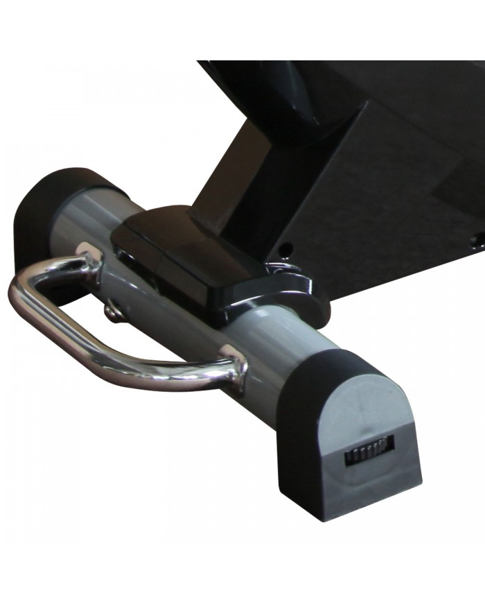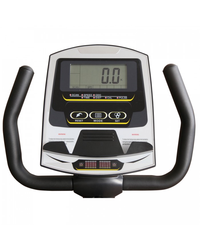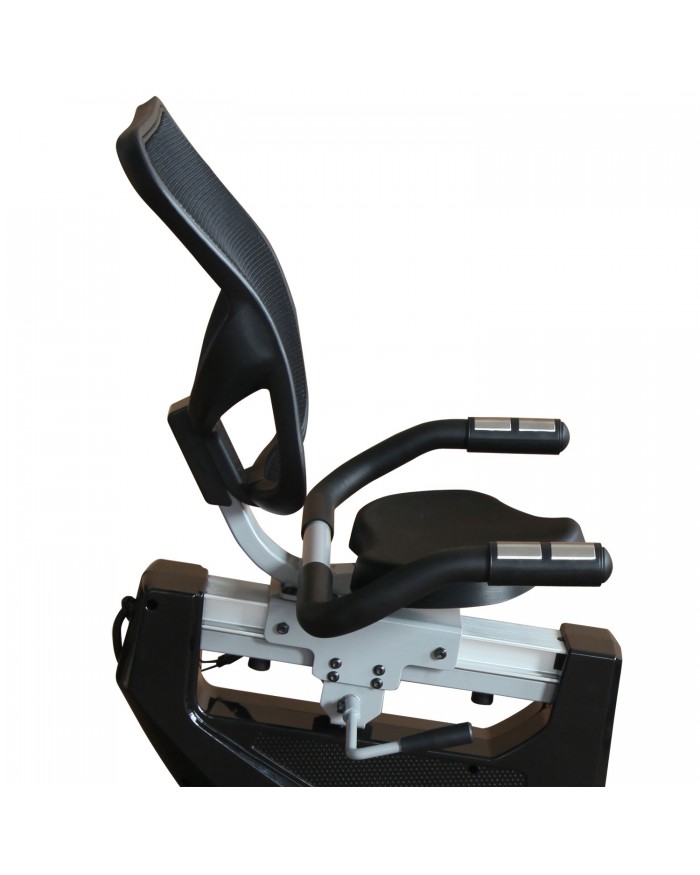 Велотренажер с удобной горизонтальной посадкой и магнитной системой нагружения. Мягкое регулируемое анатомическое сиденье с вентилируемой спинкой для правильной осанки. Датчики измерения пульса расположены на рукоятках и позволяют контролировать частоту сердечного ритма во время движения. Рифленные нескользящие педали позволяют удобно зафиксировать ногу с помощью регулируемого ремешка.